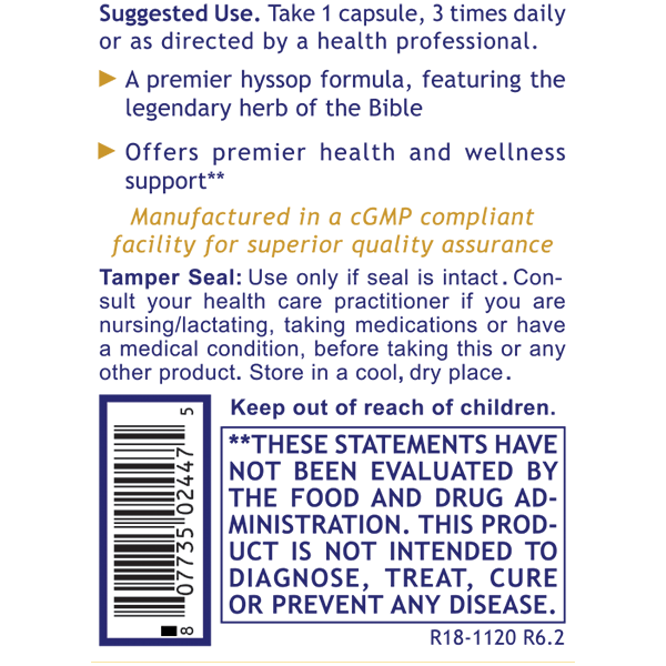 This premier quality complex features our unique hyssop formula, the legendary herb of the Bible. Hyssinol™ is a key nutraceutical hyssop formula which is traditionally used for respiratory health and also provides effective immune support.